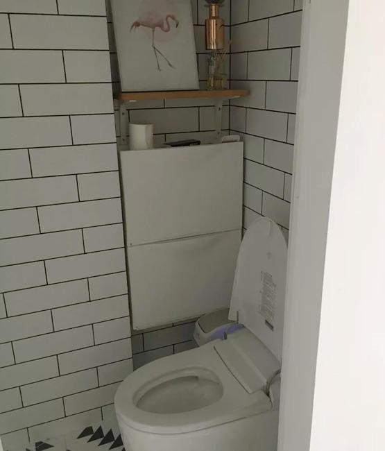 這是一個獨立的馬桶區域,利用墻面的凹槽,裝了收納儲物柜,用來收納一些常用的物品。
