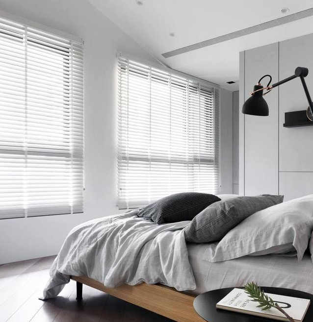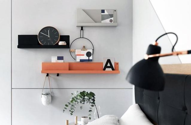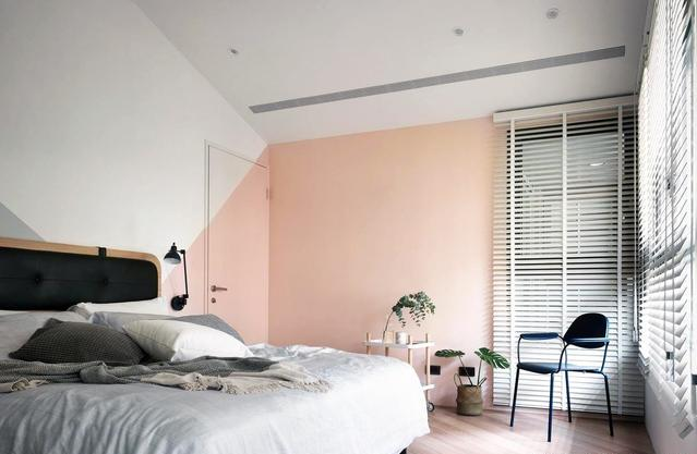 以三色層板延伸,打造主臥斜線條趣味 設計師打造斯勘地那維亞的風格,把當地小閣樓斜屋頂的造型融入居家,客廳的地板與天花,以木皮斜向拼貼,帶出簡約卻不簡單的設計感;主臥則在窗邊打造斜屋頂框架,更配合墻上的三色層板架,將空間以白色、淺灰搭配粉橘的三色油漆,漆出有趣的線條感。