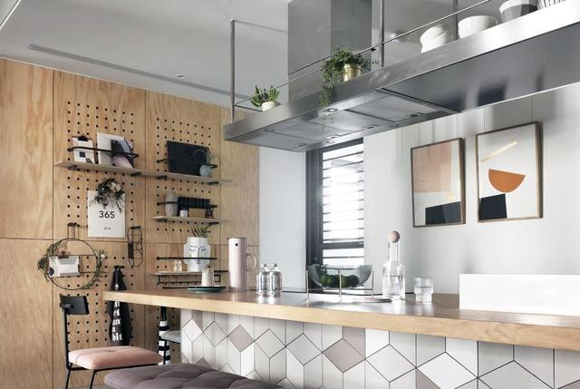 中島底座的圖案色彩,凝聚吸睛焦點 破除了原本封閉的格局,將原先密閉窄小的廚房,串聯成開放的餐廚區,以中島銜接料理臺與水槽,加大了工作臺面,讓喜愛下廚的女屋主,擁有更寬闊的烹飪空間。墻面以洞洞板安裝層板架,方便放置料理瓶罐、食譜及小物。