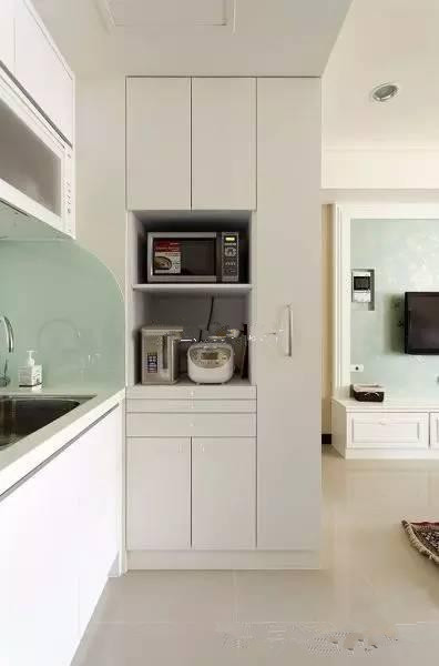 因為客廳另外一側的位置不是很寬,只用作廚房。櫥柜與墻面平行,絲毫不占據活動空間。