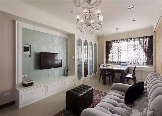 客廳空間非常寬敞,電視墻造型相對也要更為復雜,淡藍色印花墻紙更顯優雅與溫柔。