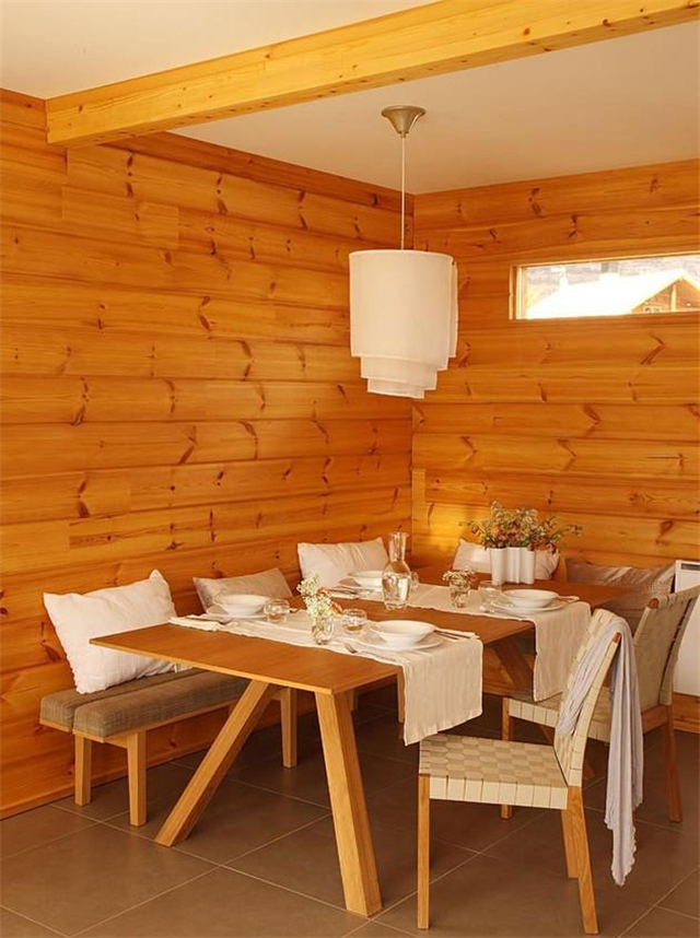 上面是一個(gè)小屋風(fēng)格的角落餐廳,有一張極簡(jiǎn)的木桌子和一張帶白色枕頭的木長(zhǎng)椅作為靠背。整體設(shè)計(jì)非常現(xiàn)代,很適合這座由埃科鮑爾和愛沙尼亞建筑公司在西班牙建造的現(xiàn)代山間小屋。