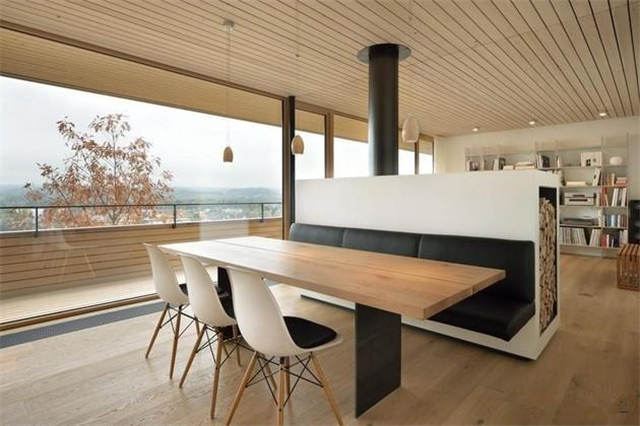 下一個(gè)餐廳是一個(gè)與起居室分隔開的房間,有一個(gè)黑色的皮革餐桌、一個(gè)木爐子和一個(gè)木材儲(chǔ)藏室,所有這些都建在一個(gè)部分的墻上。這張木桌與木地板和天花板完美匹配。來(lái)自K·M·architektur。
