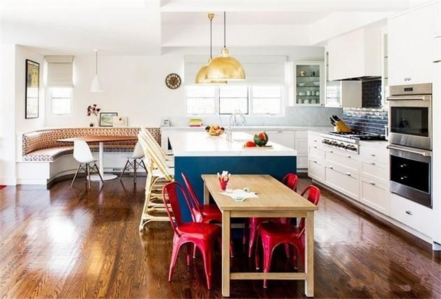 對(duì)于一個(gè)豪華的Nook設(shè)計(jì),您可以使用這個(gè)宴會(huì)早餐Nook創(chuàng)意(上圖),在一個(gè)世紀(jì)中期的家中發(fā)現(xiàn)。如果你的廚房有足夠的空間,你可以把另外兩張椅子拉起來(lái),讓這個(gè)角落為四個(gè)人設(shè)計(jì)一個(gè)宴會(huì)。請(qǐng)注意,內(nèi)置自助餐是如何將廚房空間分隔開來(lái),從而創(chuàng)造出一個(gè)優(yōu)雅的用餐區(qū)的,當(dāng)然,大窗口會(huì)讓您的早餐更加美味。