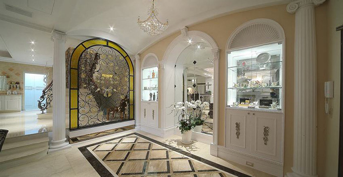 門廳設計技巧5、玄關是進門之后最先看到的部分,相當于房屋的臉面。據心理學分析,第一印象通常產生于前七秒。于是,來人對玄關印象的好壞會影響到對整個房屋的感官。客廳玄關的間隔很有講究,從風水上說應該下面實心上面通透,可以選擇通透的磨砂玻璃或者空心的博古架之類。