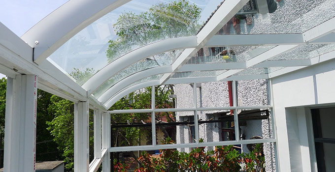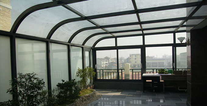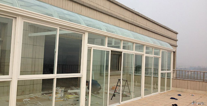 結(jié)構(gòu)組成:立面采用單玻塑鋼窗(或者雙玻塑鋼窗),頂面采用彩鋁方管框架結(jié)合8mm鋼化玻璃(或者5+5夾膠玻璃,5+5單面鋼化夾膠璃,5+5雙面鋼化夾膠玻璃)。