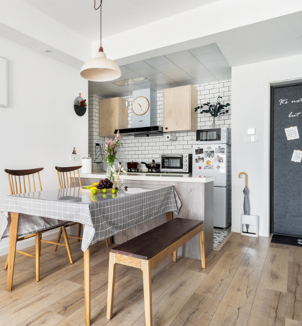 淺色木地板和木質(zhì)餐桌椅,氣質(zhì)清新,鋪上灰色格子桌布,立馬有了與郊游野餐般的休閑氛圍。半高的隔斷分隔開來,卻又不會(huì)遮擋視線。