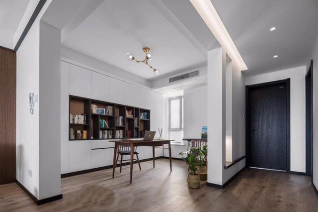 選用開放式書房,減少墻壁帶來的壓迫感,也空出了走廊空間,進(jìn)門直望視覺感官更加通透;用擺放整齊收納規(guī)范的書柜直接作為墻面裝飾使用,更有生活氣息,也減少了過于繁雜的擺件;書房空間開闊。