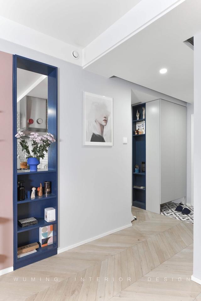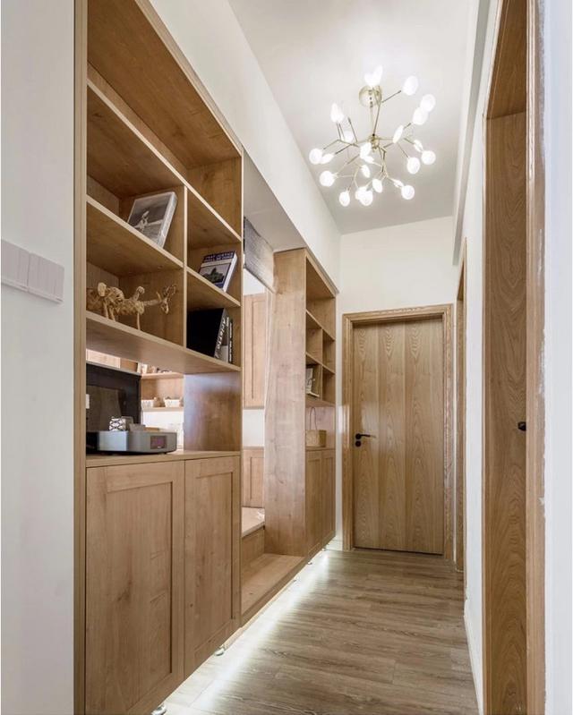 走廊較窄的情況下,做成全封閉式柜體,讓人感覺(jué)壓抑?推掉部分或全部墻體(具體根據(jù)實(shí)際空間和需求而定)打造一個(gè)擺放柜,上面可以放上自己喜愛(ài)的裝飾品,節(jié)省空間又增加了收納。