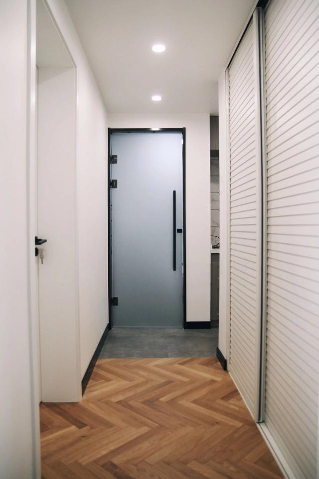 拆了右側(cè)墻壁,換成玻璃門(mén)且往里移,留出一個(gè)開(kāi)架儲(chǔ)物空間,走廊寬度變大,長(zhǎng)度變短。