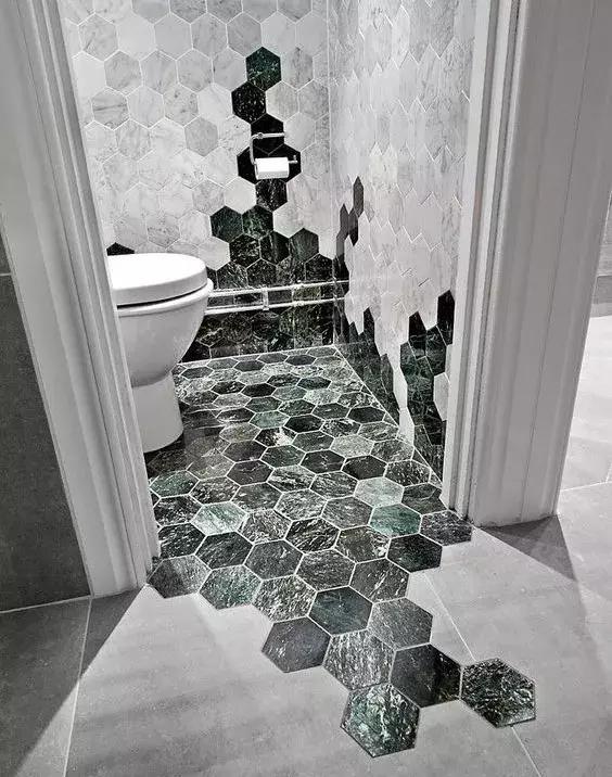 同一種瑪瑙綠瓷磚,從墻面一直延伸至地面,視覺上弱化墻地面交界線。