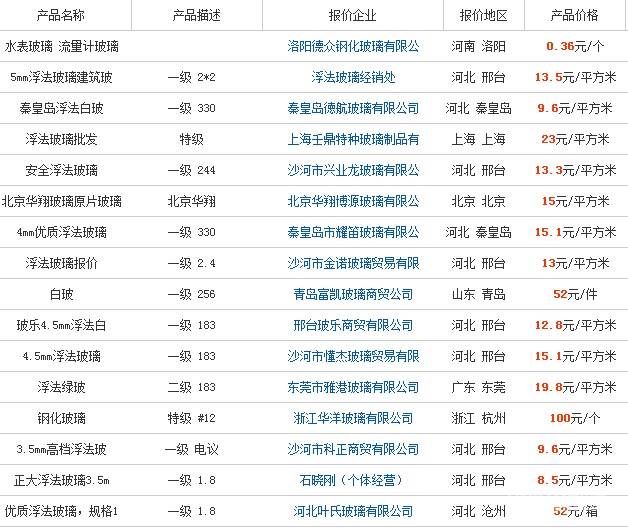 浮法玻璃價格表: