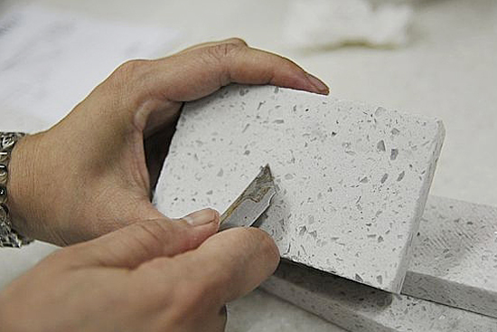鋼刀劃過,留下白印的是假石英石,因為板材硬度不如鋼,被鋼刀切開表面,露出里面的白色。而純石英石被鋼刀劃過,只會留下一條黑印,是鋼刀劃不動石英石,反而留下鋼的痕跡所致,一黑一白,真假立現。