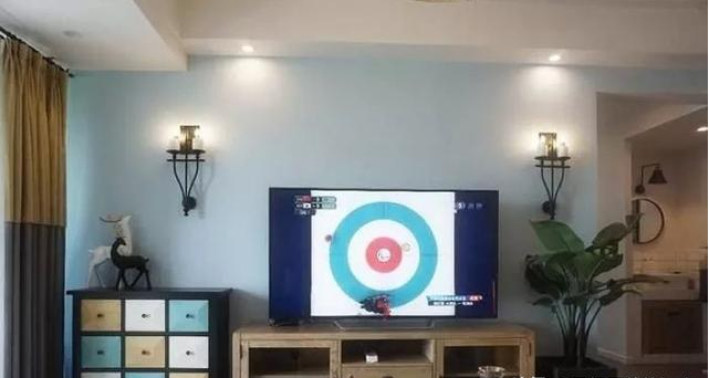 電視背景墻,刷了我最喜歡的藍色,墻上還裝了兩盞壁燈,旁邊放一盆綠植,簡單又好看。