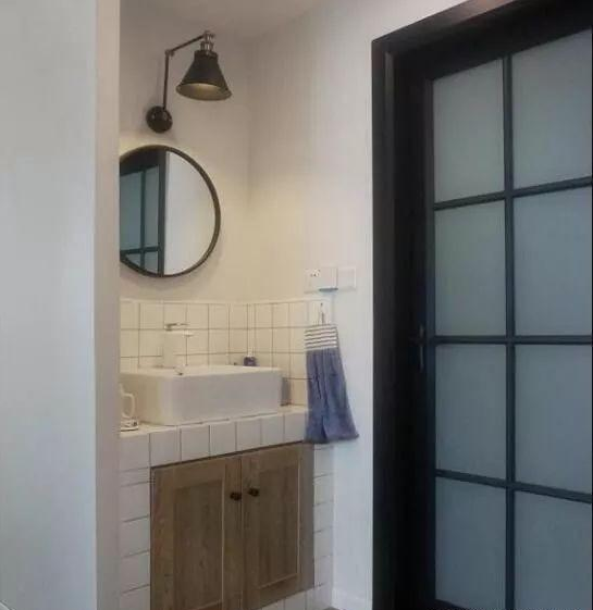 衛生間,洗手池安裝在門口,下面裝了個儲物柜,用來存放一些衛生用品。