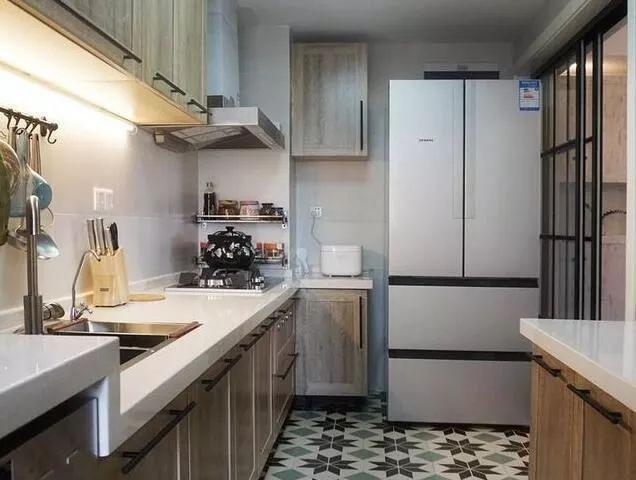 廚房里面,裝了一整排的櫥柜跟吊柜作為收納,白色的臺面跟墻壁又讓廚房顯得很整潔。另外,在推拉門的邊上還放了臺冰箱,空間利用得很好。