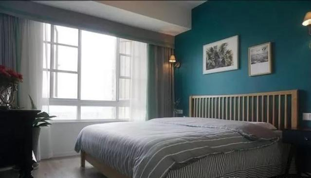 臥室,墻壁上刷了墨綠色的乳膠漆,看著很舒適,還有助于睡眠,而且因為開了扇大窗的原因,里面的光線也是特別好。