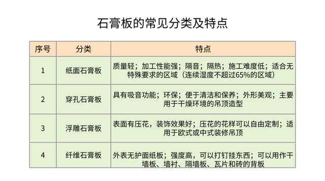 石膏板的造型很多樣,有平直板,也有制成浮雕圖案的,還做成帶有孔洞的裝飾板,我簡單列了個表,把常見的幾種以及它們各自的特點都做了歸納,詳情看圖↓