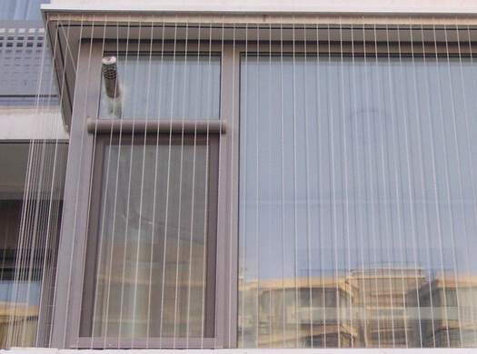 7、對于陽臺過高的情況,可以采用中間橫向拉一根鋼絲,然后用十字扣將橫向與縱向的鋼絲鎖緊,以增加隱形防護網的安全性。若高度超過十字扣的應用高度的時候,則需要采用大鋁條對隱形防護網進行加固。
