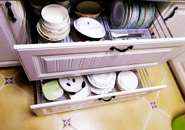 爐子下的碗、籃、柜門抽屜,實用方便,主要放一些常用的筷子。