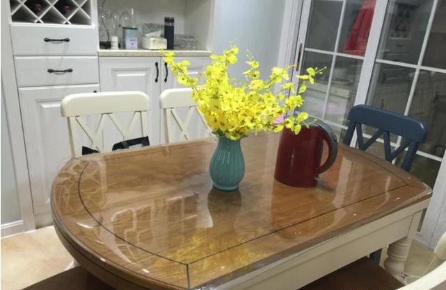 將桌布從桌子上取下,并用透明玻璃覆蓋。它美觀隔熱。清潔也很方便。直接擦布就行了。