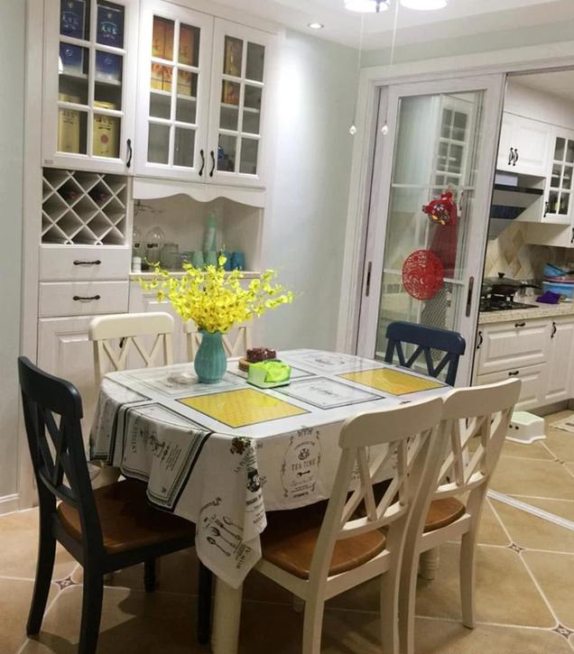 餐廳空間不大,靠墻建了一組餐具柜,還設計了酒柜,時尚美觀。中間放著一小群桌椅,上面鋪著桌布。他們看起來又好又臟。現在他們已經住了三年了,但他們和剛搬進來的一樣。