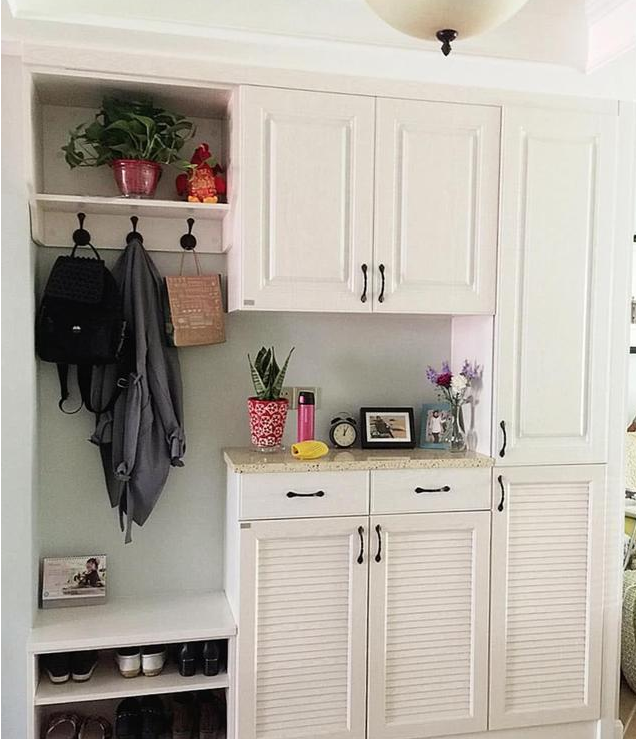 這是我們的玄關鞋柜,設計很合理,長凳柜+鉤子+封閉柜組合,空間利用很強。媳婦每天打掃這個地方。對她來說真的很難。這個敞開的長凳柜有一個很深的內側。男鞋和女鞋都很容易接受。它非常實用。