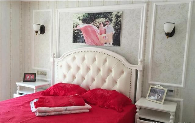 床頭的主墻掛著我們的結婚照,四周用石膏線裝飾,壁燈也裝上了。大氣是自然的。自從床進來以后,它就成了一套紅色的四件套衣服。它溫暖而快樂。