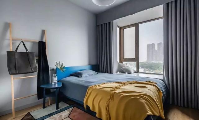 次臥與主臥比起來,裝修出的氛圍感更加活躍,木制樓梯架子來充當床頭柜的功能,有種返璞歸真的效果。