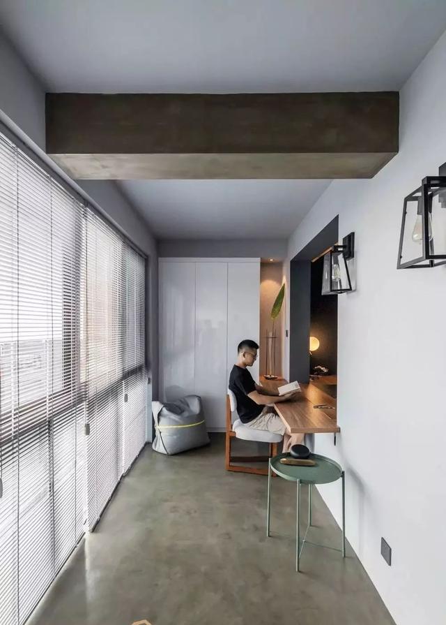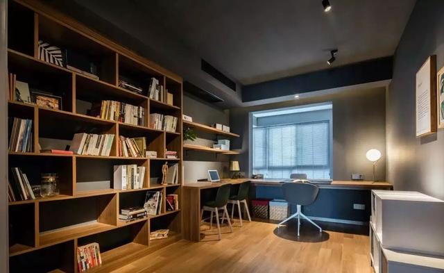 書房的墻面做成了開放式書架,圍著窗戶位置打造出一體式辦公區(qū)域,再用用高級灰和點光源,營造出一個安靜的學習、辦公空間。