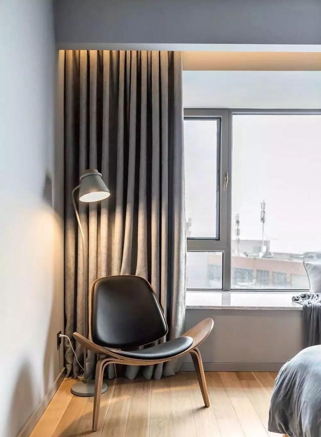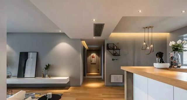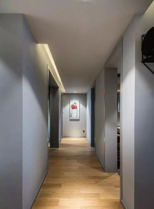 室內墻面多采用深灰色,顯得非常的高級,再配上淺木色的地板,又讓整個空間彰顯出大方的一面,高開門框設計,是讓整個空間更加大氣開闊的常見手法。