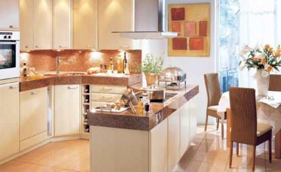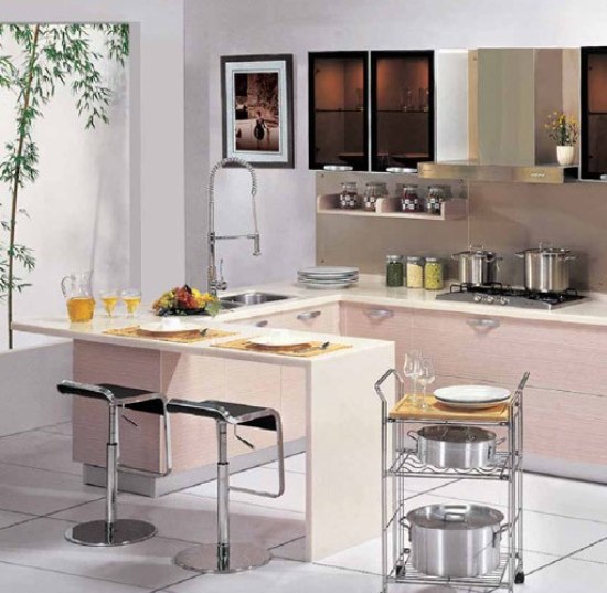 香檳色的整體廚房?jī)?yōu)雅別致,內(nèi)嵌式的照明增添了夜晚的浪漫感覺。N 形的轉(zhuǎn)角設(shè)計(jì)正好將餐桌和操作區(qū)自然分開,不但操作的過程十分方便,而且料理臺(tái)可以放置食物,用餐過程中取拿都十分方便。