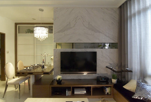 裝修TIPS:電視墻局部穿透的設計,使單親媽媽在下廚也能注意女兒動靜。