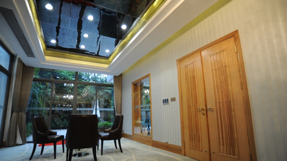 如果層高不高但是想做吊頂,可以選用玻璃吊頂。玻璃的反射光配合燈光能夠在視覺上拉伸空間。玻璃種類較多,其中彩繪玻璃、噴砂玻璃因裝飾效果特別好,是做吊頂的好材料。