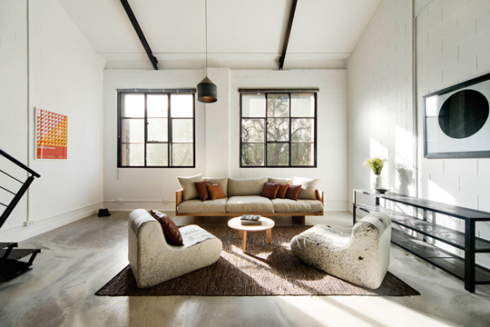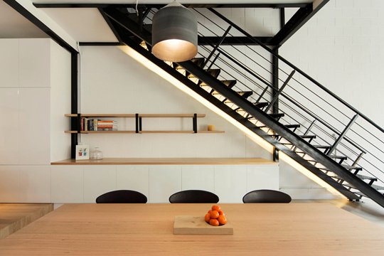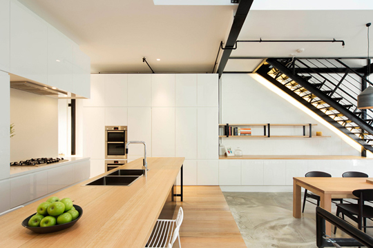 天花板上的橫梁不僅有承重的作用,還巧妙地與臺階共同起到分隔空間的作用。L型的櫥柜設計在避免了墻壁的單調的同時,延展了空間的視覺效果。