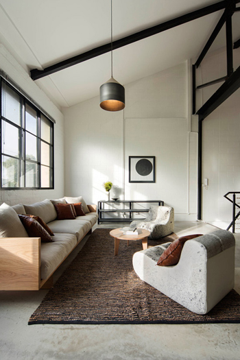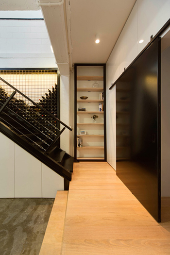 設計師沒有讓樓梯間荒廢,而是搭建一軟塌,在墻壁還安置幾個隔板,放置書本,就這樣一小型書房渾然而成,將空間利用率提高到極致。