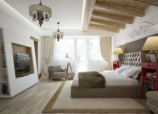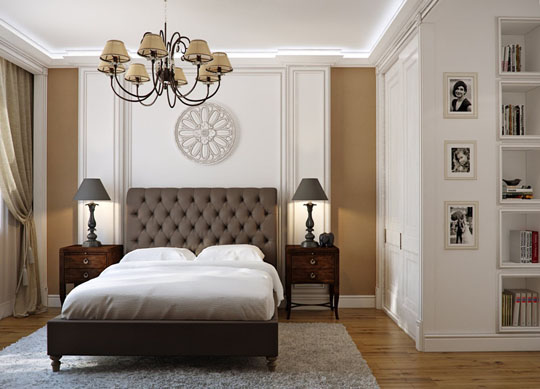 兩個(gè)木質(zhì)的對(duì)稱高腳床頭柜,不僅造型古典大方,而且增加空間的收納功能,和吊燈一起拉寬空間視覺(jué),形成獨(dú)有的三角立體感。潔白的墻壁更為空間增加亮色。