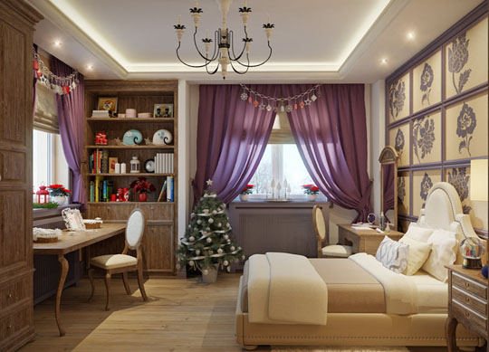 采用木質(zhì)的陳列架增加空間的收納功能,九宮格圖案的床頭背景墻增添了空間立體感和古典藝術(shù)氣息,此外還與紫羅蘭色的窗簾相融合。