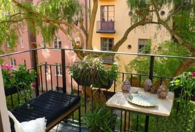 除了寬度外,這款小陽臺在長度上也十分有限,典型的迷你型陽臺,難道我們就任憑它空缺著,偶爾憑欄眺望?當然不!以矩形收納柜作為座椅,鋪上舒適的毛毯,放上柔軟的靠包,可以多放幾個,營造足夠的舒適感,而收納柜也能收納閑散物品。除此職位,懸掛式小花壇是提升陽臺品質的漂亮手筆,并不占絲毫陽臺空間。