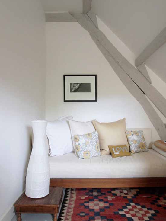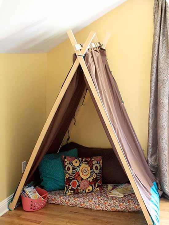 說到“邊角料”空間,那么自然不能遺漏閣樓上有待開發的區域,而其中最難攻克的無疑是斜屋頂下的空間,尤其是墻角的位置。如果想要合理利用這個區域,就一定要因地制宜——將一個三角造型的“帳篷”擺放于此,正好可以填補畸形區域,再往里面放上坐墊、靠包,一個“野生”閱讀區就誕生了。