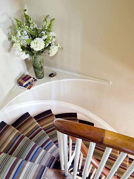 螺旋造型的樓梯與墻角看上去八竿子打不著,其實也能為“增大”家居使用面積出一份力。在墻角安裝上一款弧形設計的擱架,再于其上擺放插花作為樓梯間的裝飾,肯定能讓樓梯小角落驚艷一把。由于弧形的設計非常人性化,所以人們在行走時也不會被擱架碰傷。擱架上還能放幾本小書,當你閑來無事的時候,大可以停住腳步,坐在樓梯上隨意閱覽。