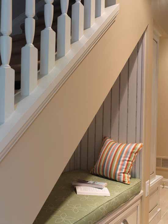 對于小戶型的家庭而言,客人一多,許多麻煩的問題就會接踵而來——不是客廳太小,坐不下許多人;就是沒有多余的臥室作為客房。那么,何不利用樓梯下的空間呢?準備一款寬敞的沙發椅,擺放上舒適的墊子,第二客廳就打造好了。而在必要時刻,它又可以充當臥床,如此便解決了賓客的住宿問題。