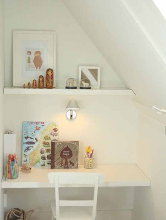 這個樓梯間的區域被打造成了明亮的工作學習區,整個空間用白色包裹,又配合上壁燈的照明,時尚而明朗。底下以大擱架充當書桌、頂部以小擱架充當書架,都是十分節約空間的設計。