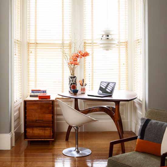 各種不規則的室內空間,總能尋覓出一些無法被利用得當的尷尬角落,比如家居中常見的飄窗旁的凹形區域。其實,只要善加利用,這里也可以被完美改造。為了保持明亮的采光,并且不遮擋飄窗,最好選擇較為矮小、稀疏的家具——一個木柜、一張木桌的擺入即可成就這樣一個家居辦公區。