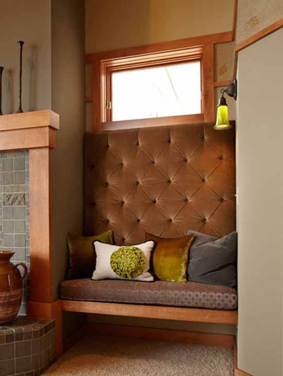 即使是畸形的區域,在設計師的眼里,也能夠物盡其用。壁爐旁的小角落,正好可以利用兩面墻壁之間留出的空間,在此處定做一款沙發椅。沙發椅特殊的椅背處理、軟包靠墊的設計可以讓這個休息區舒適加倍,而墻面頂部開出的小窗則給這里帶來了恰到好處的光線。