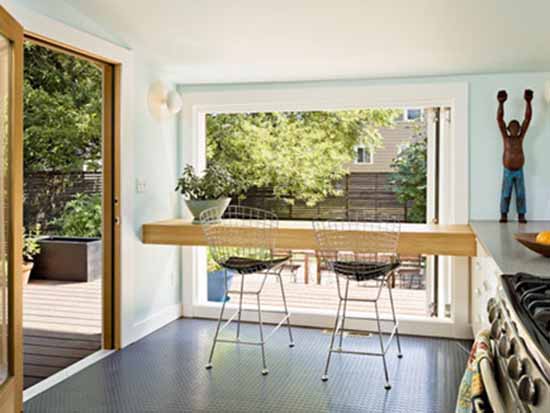 這家被作為廚房的小屋雖然低矮,卻勝在設計得很有美感。房屋有一側的墻體采用了落地窗設計,遠而觀之,就像是一個畫框,與窗外的美景形成了絕佳呼應。一塊厚實的木板橫臥“畫框”中間,旁邊又加上了兩張高腳椅,如此一來,原本可能荒廢的角落就變身為早晨角,在這里悠閑地品一杯咖啡,然后充滿活力地展開新的一天。
