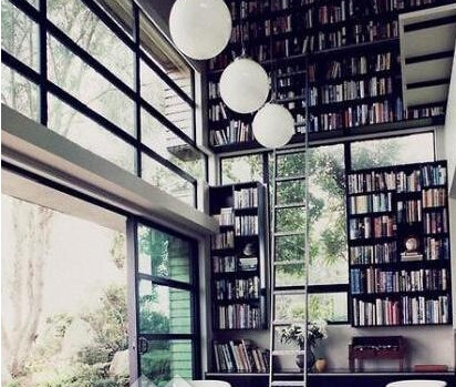 書架“爬”上了玻璃窗,窗戶和書架被巧妙的組合在一起。深色的地板、書架搭配著白色的椅子和吊燈,在內(nèi)斂嚴(yán)肅的同時不失雅致和活力。