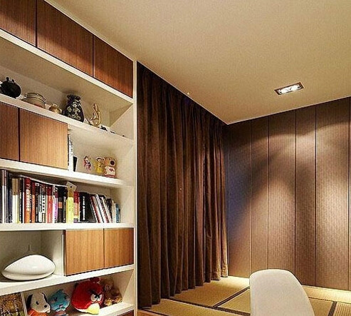 書房內(nèi)地臺的設(shè)計為這間書房提升了整體舒適度,大面書架的設(shè)計可以幫助房主收納許多書籍,整個書房中運(yùn)用暖色的照明來烘托出溫馨的氛圍,咖啡色系的墻面與木色地板都使這一空間中透出一種沉穩(wěn)。