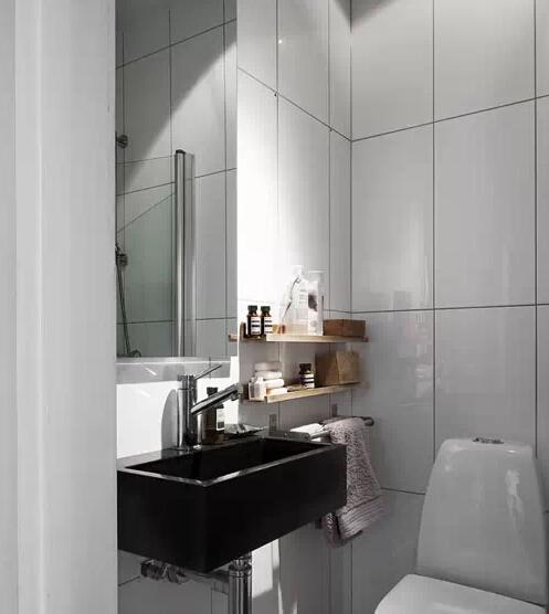 壁掛式臺盆一直是小空間內(nèi)解決臺盆安裝問題的最簡法則,由于只需要保留一個臺盆的空間,且完全不占用地面面積,也因此變得更加受人喜愛。這個偏正方形的空間內(nèi),選擇了這款偏長的壁掛式臺盆,且選擇“顯瘦”的黑色,明智之舉。