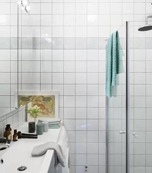 空間形狀不規(guī)矩,或者說可用空間形狀比較特殊時,自然要用更特俗的手段來應對。這款臺盆實際上一個壁掛式臺盆,但如果不能接受它外觀裸露的凌亂感,那么就用這個交錯的水泥擱板來進行一些小小的“硬裝飾”,綠色瓷磚和銀色鑲貼線是一個很適合年輕女孩的配色,為這個空間增色不少。